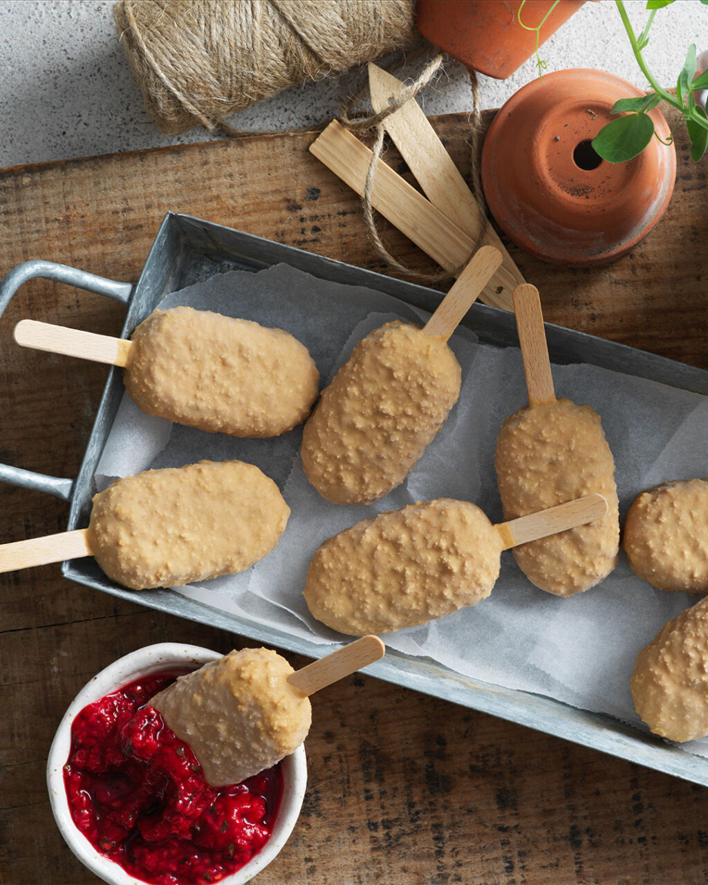 4. Smält choklad och kakaosmör i vattenbad eller micro, låt svalna något. Lägg i krossade cornflakes och doppa sedan glassen i smeten och frys igen.