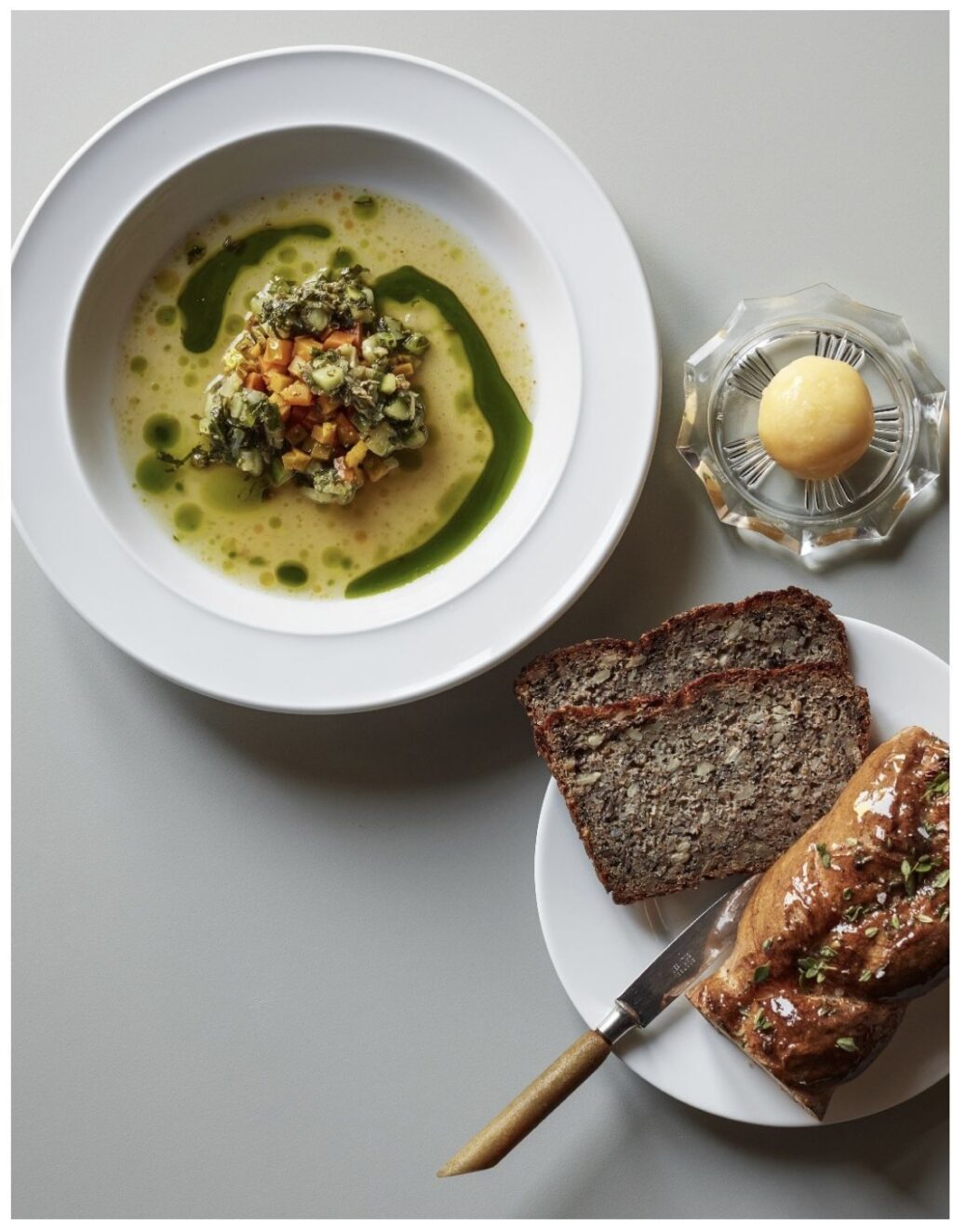1. SERVERING: Lägg 1 ½ msk av grönsakerna mitt på tallriken. Toppa med gurkdressingen och ringla dill- och spenatolja runt om. Häll på varm buljong från en kanna.